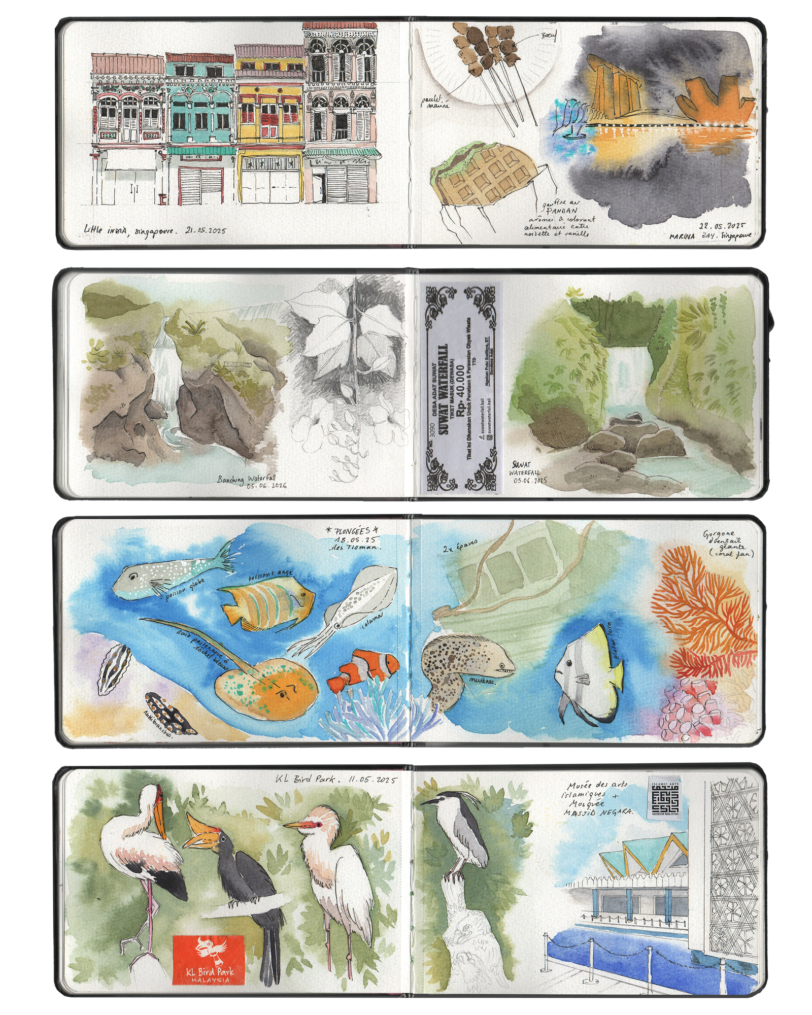 Mon parcours entre architecture, voyage et dessin m’a appris à observer, à capter les détails, la lumière, les textures, et à raconter des histoires visuelles ancrées dans l’expérience du terrain.